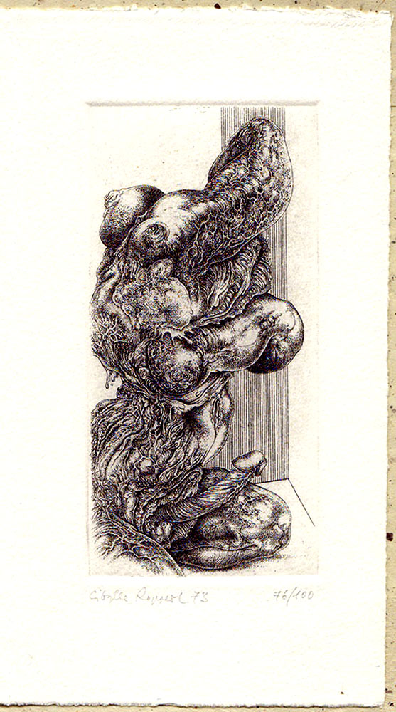Das Buch blieb ein eher mäßiger Erfolg, denn die ersten Exemplare dieser Vorzugsausgabe erwarb ich über die Taubert-Listen mit modernem Antiquariat. Mich begeistern sowohl die Graphiken wie die Gemälde Frau Rupperts, in deren Kunst die Grenzen von Seh- und Denkgewohnheit brachialer überschritten werden, als es Surrealismus & Co. vermochten.